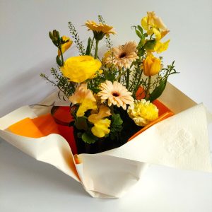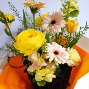 あけると素敵な黄色中心のフラワーアレンジメントが!