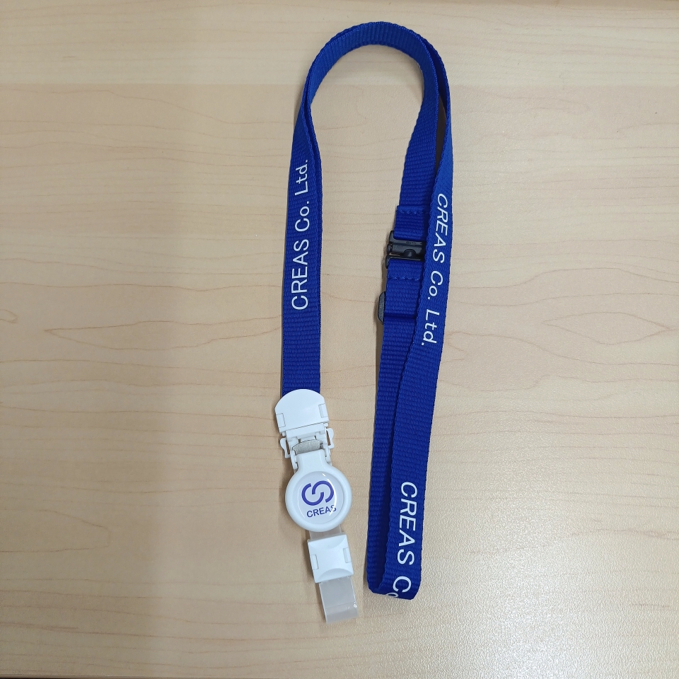弊社のイメージカラーはブルーなのですが、紺藍色のストラップに白く印刷した会社名が映えます。