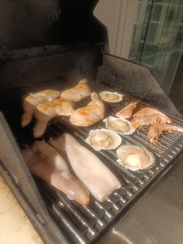 グループに分かれて肉、野菜、海鮮を焼く!私は切る係をして、焼く係の方へお渡しです。