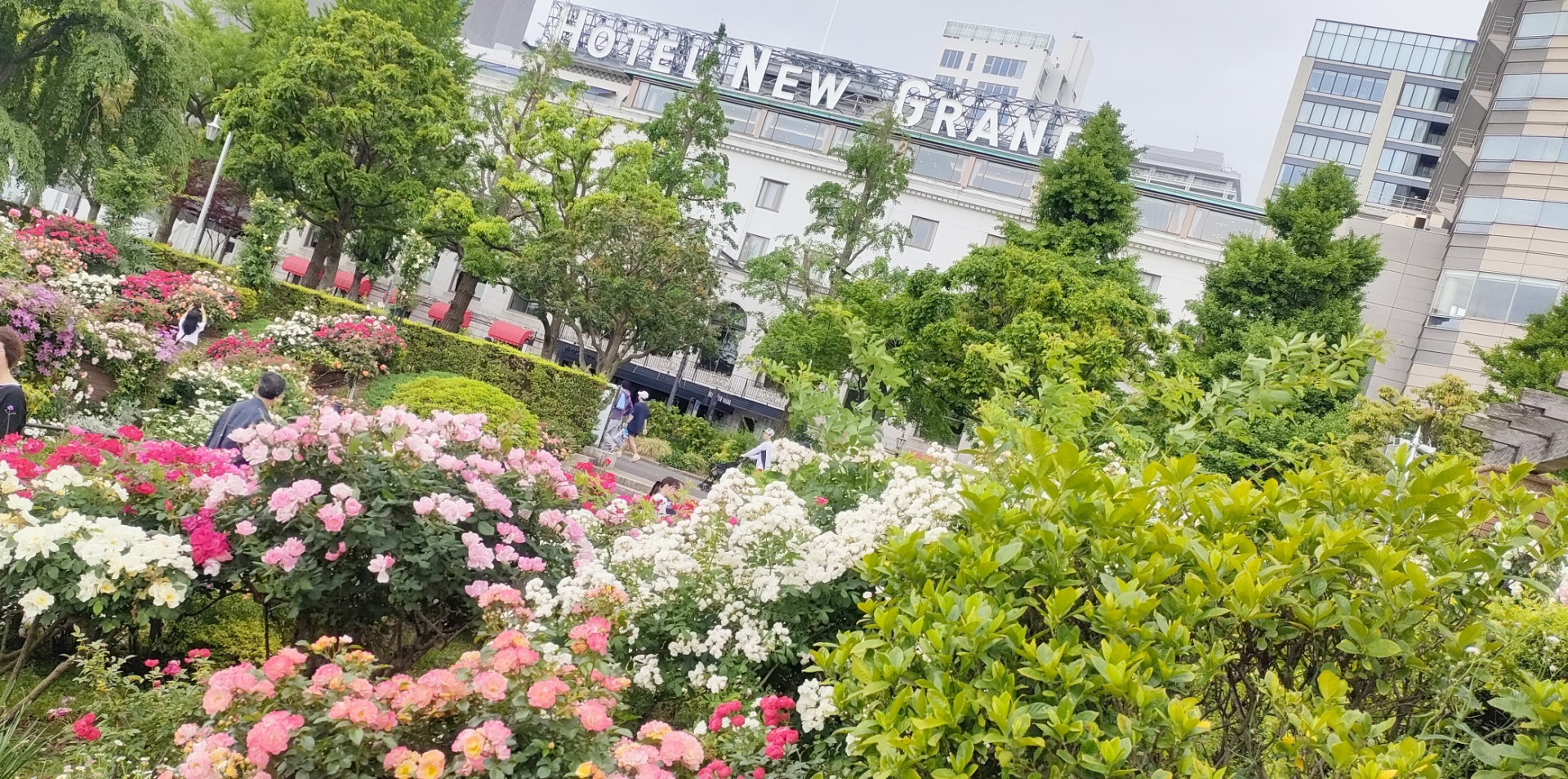 ホテルニューグランドと一緒に写してみました。この辺りはまだ全部開花していない感じで新緑も多かったです。